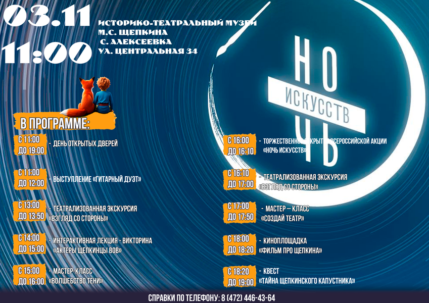 Ночь Искусств в Музее М. С. Щепкина! ✨ Дорогие друзья! Приглашаем вас на незабываемую Всероссийскую акцию «Ночь искусств» в музее М. С. Щепкина! ???? 3 ноября вас ждет волшебный вечер, наполненный творчеством, вдохновением и яркими впечатлениями! В программе: ✨Увлекательные мастер-классы - раскройте свой творческий потенциал и научитесь чему-то новому! ✨Театрализованная экскурсия - погрузитесь в мир театра и узнайте интересные факты из жизни великого актера Михаила Семеновича Щепкина! ✨Живая музыка - насладитесь прекрасными мелодиями в исполнении талантливых музыкантов! ✨Подарки - каждый гость получит приятный сюрприз! Не упустите возможность провести этот вечер в атмосфере искусства и творчества! #НочьИскусств #МузейЩепкина #Культура #Искусство